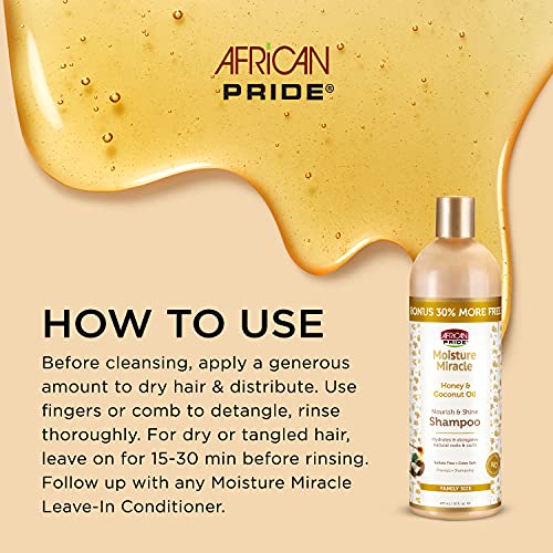 PROVEN HAIR CARE – African Pride Moisture Miracle Honey & Coconut Oil gently cleanses natural hair to remove dirt & buildup without stripping out natural oils. The blend of Honey & Coconut Oil hydrates & adds shine to natural coils and curls.