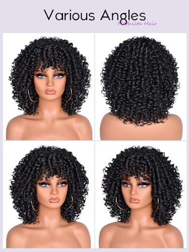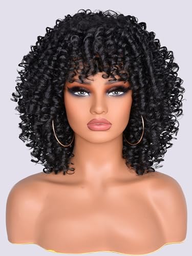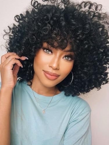 Curly Afro Wigs for Black Women Short Curly Wig with Bangs Kinky Curls Curly Hair Synthetic Wigs for African American Women (Black)