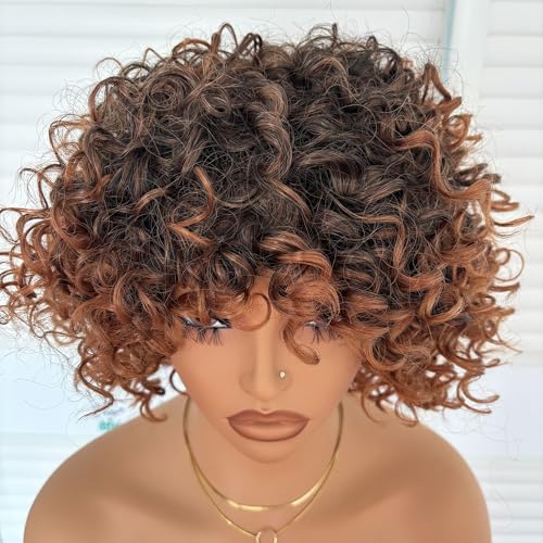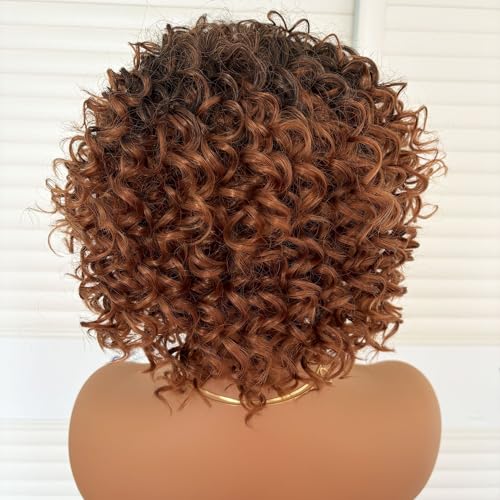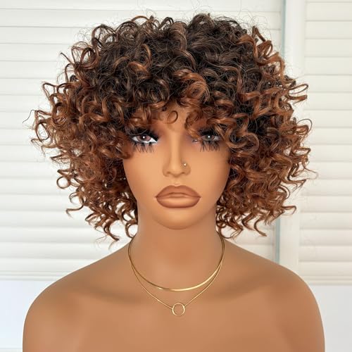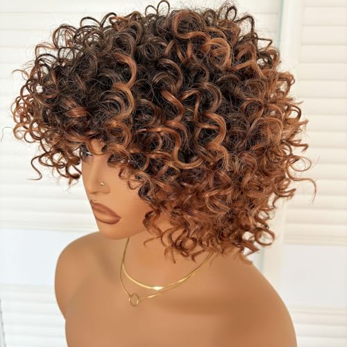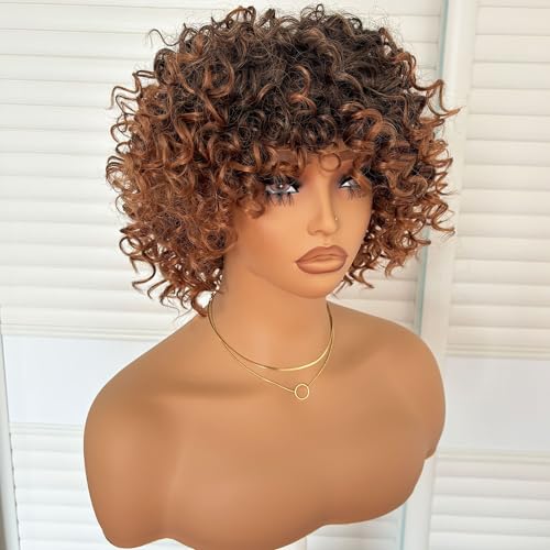 Specification: Short Kinky Curly Wig with Bangs Ombre Brown Loose Curly Bob Wig 8 Inch Synthetic Heat Resistant Bouncy Curls Full Wig for African American